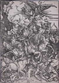En av hans tidiga framgångar som grafiker var en svit illustrationer på temat Apokalypsen utgivna 1498, hämtat ur Uppenbarelseboken i Bibeln, i vilken Apokalypsens fyra ryttare ingår.