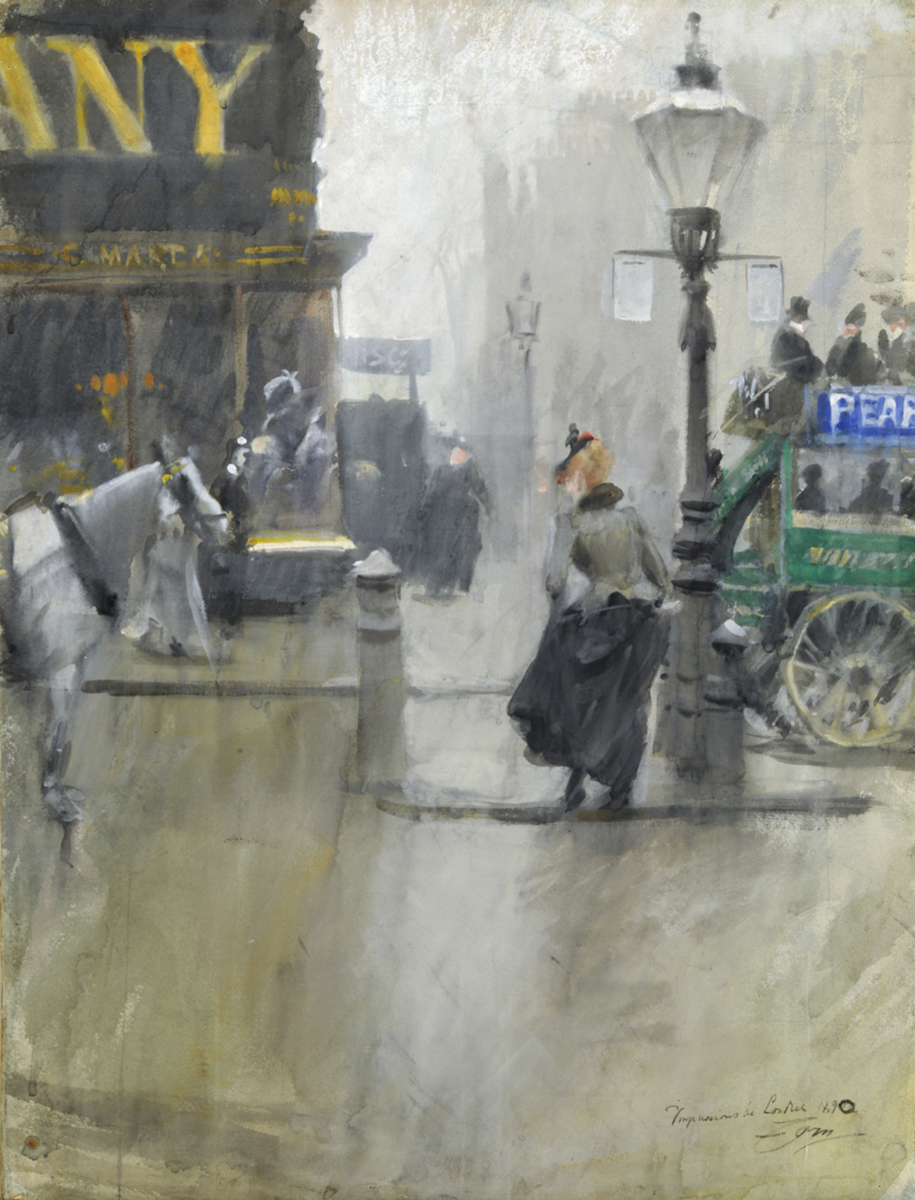 Denna akvarell med inslag av gouache ger en frisk ögonblicksbild av en gata i London en regnig dag. En ung kvinna, klädd i grått och svart, korsar gatan medan hon håller upp kjolarna för att undvika att blöta ner dem. Hon har fångats mellan en förspänd vit häst, vars kropp kapats av bildkanten, och en ståtlig gatlykta med några vidhängande reklamskyltar. En grön, dubbeldäckad omnibuss försvinner ut till höger. Den djärva, närmast fotografiska beskärningen förstärker intrycket rörelse på den trafikerade gatan. Till vänster i bilden finns en butik som säljer hattar eller någon annan produkt. Ovanför den finns en iögonfallande skylt med stora gula bokstäver som bildar ordet ”(COMP)ANY”, som ett tecken för den visuella miljö som impressionisterna intresserade sig för: storstadens moderna liv. Byggnader längre bort i bilden försvinner i diset. Några fotgängare passerar på andra sidan gatan.