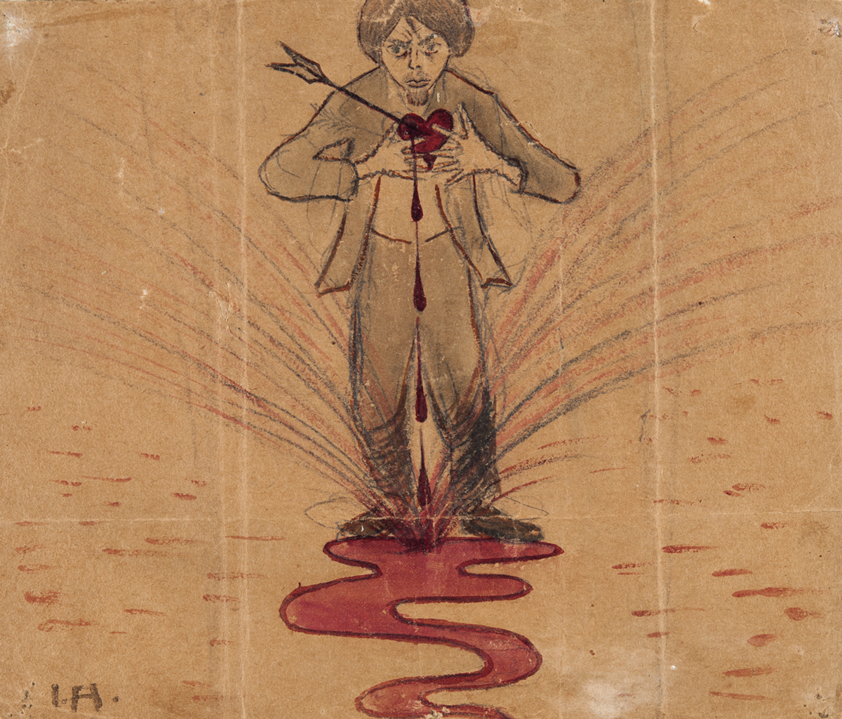 I detta självporträtt anspelar Ivar Arosenius både på sin (olyckliga) kärlek till Ester Sahlin och till den sjukdom han bar på, blödarsjuka. IA håller sig om hjärtat med båda sina händer där en pil är instucken. Stora, tunga droppar kommer från såret, blodet stänker mot marken och bildar en slingrande, röd bäck som flyter mot betraktaren.