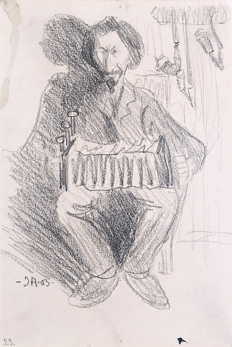 Porträtt af målaren Ole Kruse spelande dragharmonika