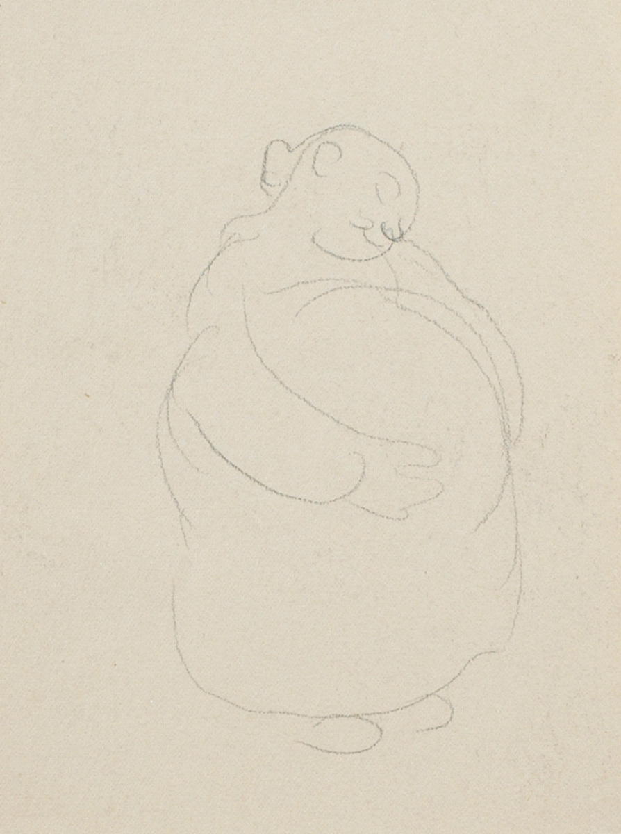 Påskrift (a tergo): Heraldisk komposition med sköld krönt av sittande barn (tecknad)