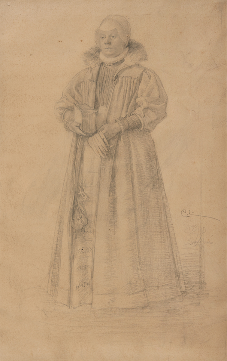 För Renässanskvinnan gjorde Karin av tjockt grått tyg en fotsid dräkt med kappa. I sin framställning av den myndiga husfrun lät Carl Larsson sig sannolikt inspireras av tyska 1500-talsmålningar. Hans plan var emellertid att ge illusion av att kvinnan stod i en dörröppning på mellanplanet i trapphuset. För detta arrangemang sökte han sig till Veronese, som på 1500-talet skapade liknande effekter i palatsen utanför Venedig.