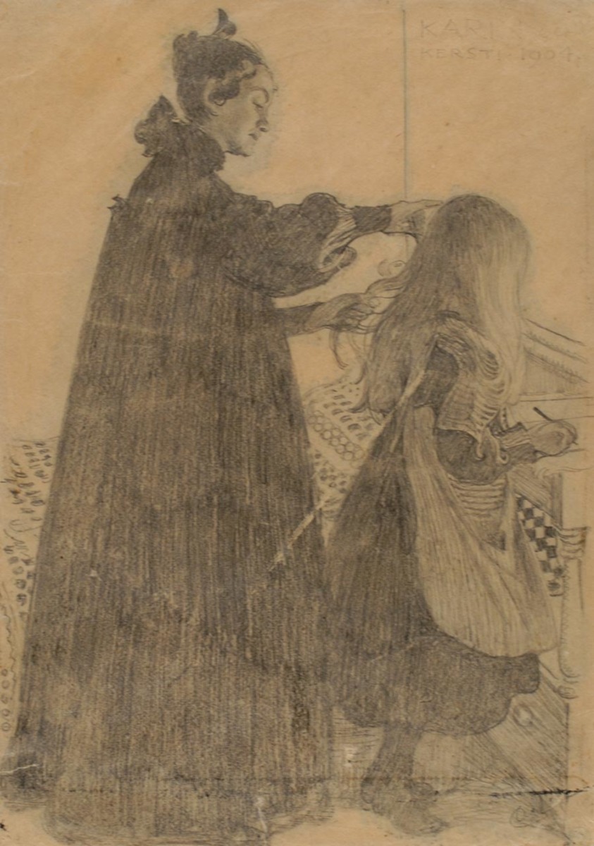 1904 gjorde konstnären en blyertsteckning med Karin och Kersti, som var direkt avsedd att omsättas i en etsning. Den visar Karin, som kammar yngsta dottern, som i sin tur skriver i sista minuten på sin läxa innan hon ger sig av till skolan.