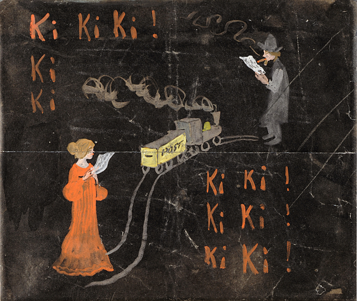 I nedre vänstra hörnet av målningen står en kvinna i rödklänning och läser ett brev (Ester Sahlin) och i övre högra hörnet står en mörkklädd man i hatt (Ivar Arosenius) och läser ett brev. Diagonalt, mellan dem, böljar en tågräls där ett posttåg är på väg från kvinnan till mannen. Det bolmar från lokets skorsten, liksom från mannens cigarr. Texten ”Ki Ki Ki!”, målat i rött, repeteras på målningen och det står också på breven som de läser. Det är en ljudbild likt tågets ”Tuff, Tuff, Tuff”, eller ljudet från tågets signalhorn ”Hi. Hi, Hi”. Men Ki är också Ester Sahlins smeknamn och på målningens baksida finns fragment av ett brev från Arosenius till Sahlin.