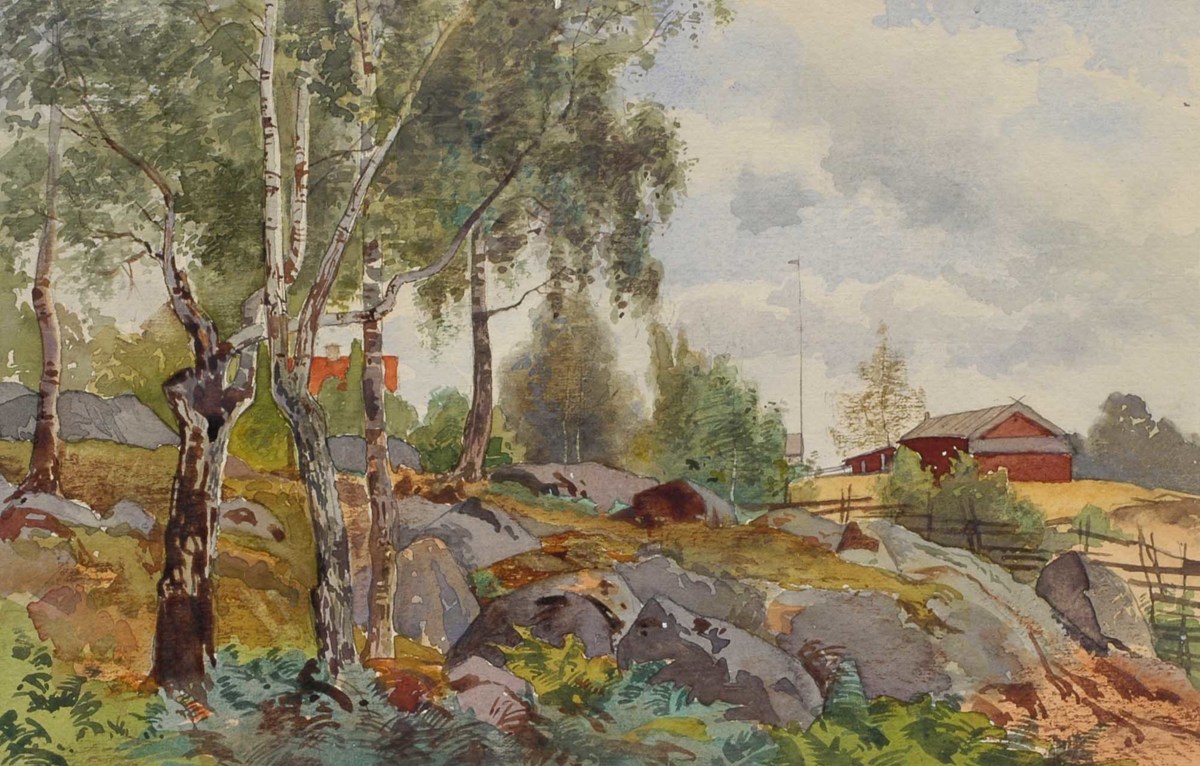 Björkarna grönskar i den här akvarellen av Anna Gardell-Ericson. I en hage står fem vitsvarta stammar. Fler lövträd avtecknas i bakgrunden. Där möter de en blå himmel, halvt täckt av vita, lätta moln. Marken är full av stora, grå stenar. I förgrunden syns ormbunkar i gröna och blå nyanser. Några hus avtecknas bortom hagen. Tillsammans med en flaggstång med hissad vimpel vittnar de om mänsklig närvaro. Till höger syns en gärdsgård som ramar in hagen, en slags skiljelinje mellan människa och natur.