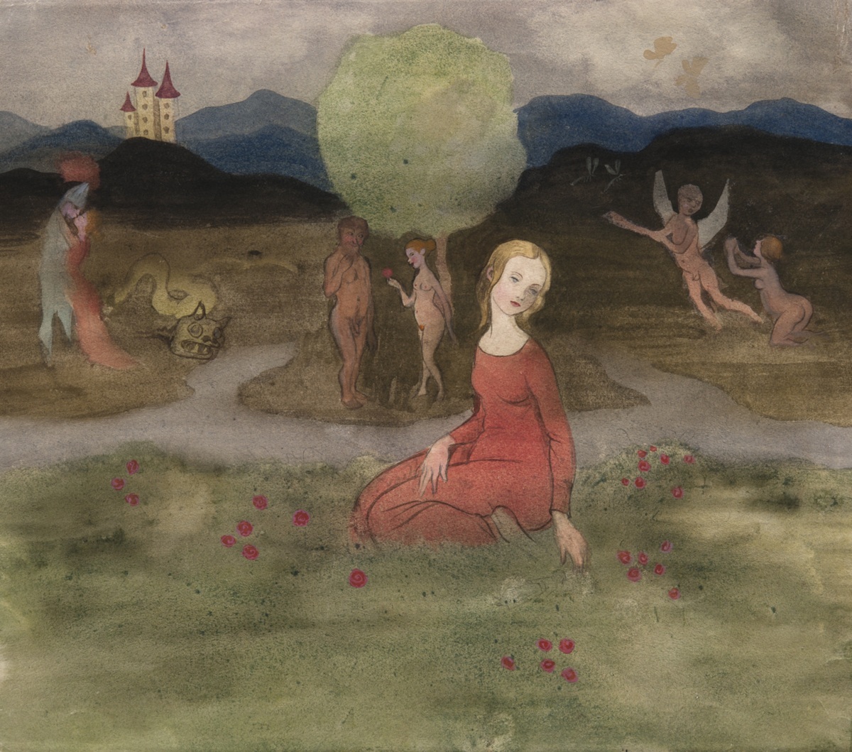 En ung kvinna sitter på en äng med röda blommor, gräset är gröngult och strax bakom henne leder stigar till olika scener. Kvinnan bär en lång, långärmad röd klänning och hennes hår är gult. Tre scener utspelar sig bakom henne med tre olika par. Till vänster syns S:t Georg och prinsessan med en besegrad drake, i mitten Eva som sträcker fram det röda äpplet till Adam, och till höger Amor och Psyke med sländor som fladdrar. I fjärran syns blånande berg med ett slott med tre torn. Målningen är ofullbordad.