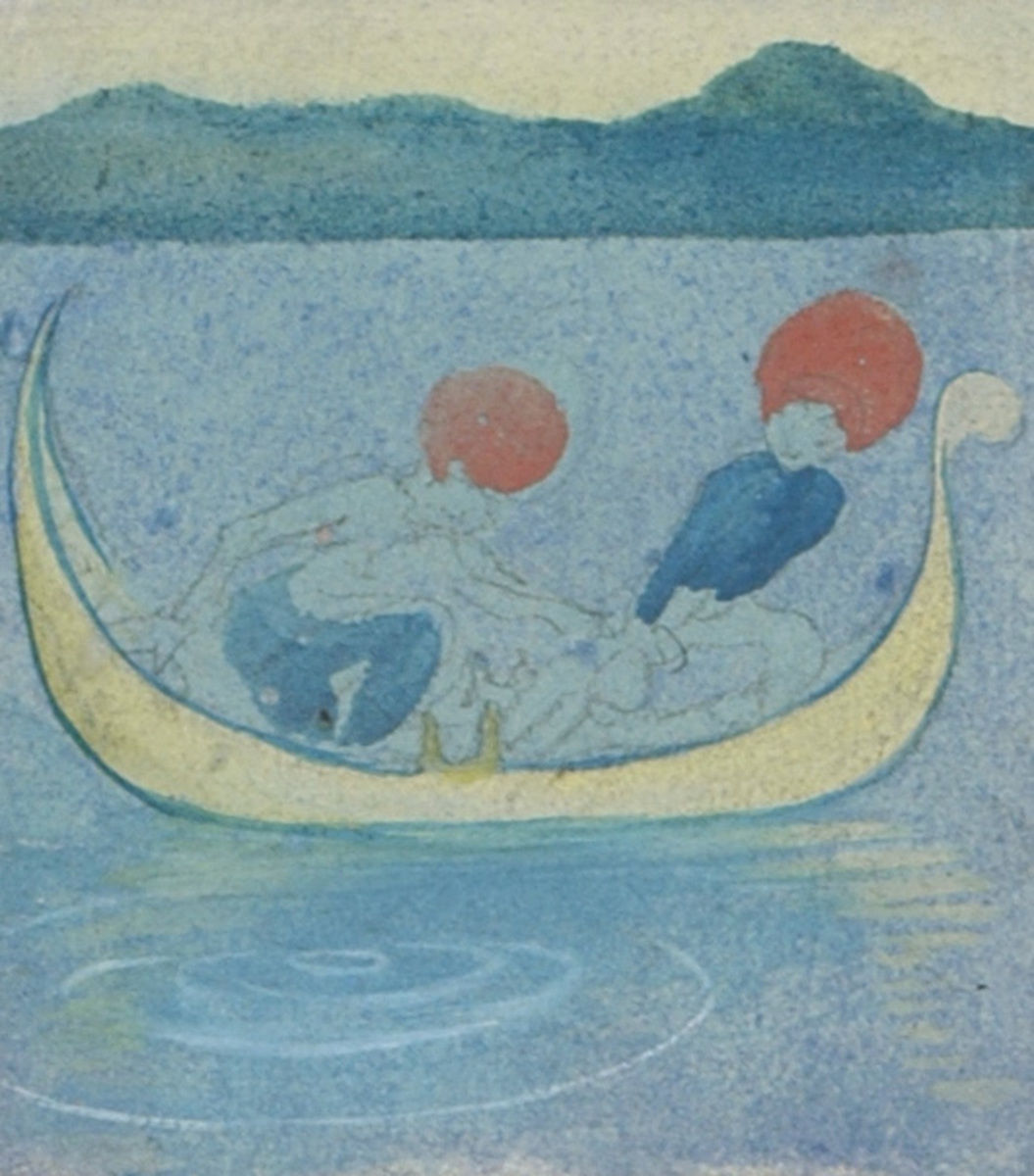 Studie till "Ett fiskafänge", en serie med orientaliskt tema. Två turbanklädda män sitter i en gul gondol som speglar sig i vattnet och männens röda turbaner lyser som två bollar i bilden. Det verkar vara lungt på sjön, vattnet är blankt och båten ligger stadigt. Vid horisonten syns ett blånande landskap. Männen är ute på fiske och har just dragit upp en fisk ur vattnet. Man ser hur de drar och kämpar i båten och vattnets ringar avslöjar att något (stort?) just dragits upp ur djupet.