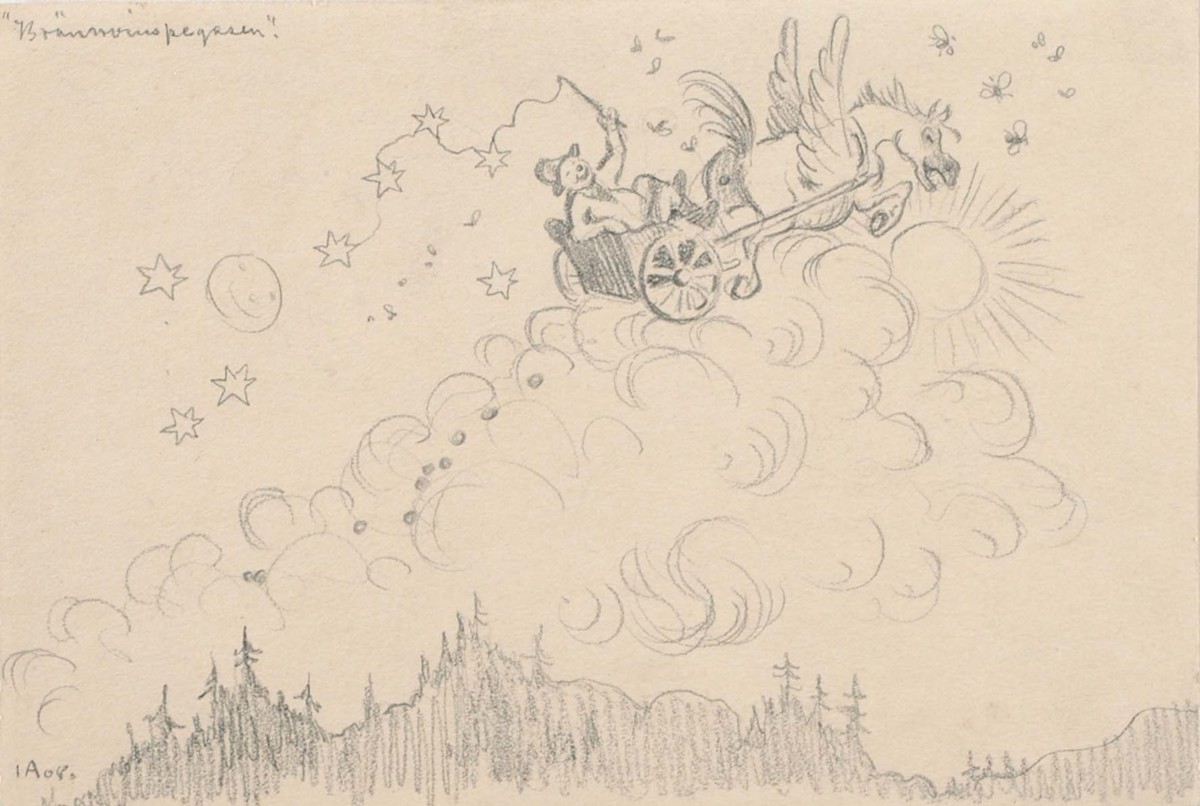 En teckning som visar en man med hatt som sitter i en vagn som dras av en pegas, en mytologisk varelse i form av en bevingad häst. Ekipaget flyger mot skyn över grantopparna. På himlen lyser en leende måne, stjärnor, som tycks komma ur hästpiskan, tillsammans med solen som tittar fram bakom molnen. Insekter surrar framför pegasens huvud och pegasen själv släpper runda "hästäpplen" efter sig som ett radband genom skyn. I övre vänster hörn står det "Brännvinspegasen".