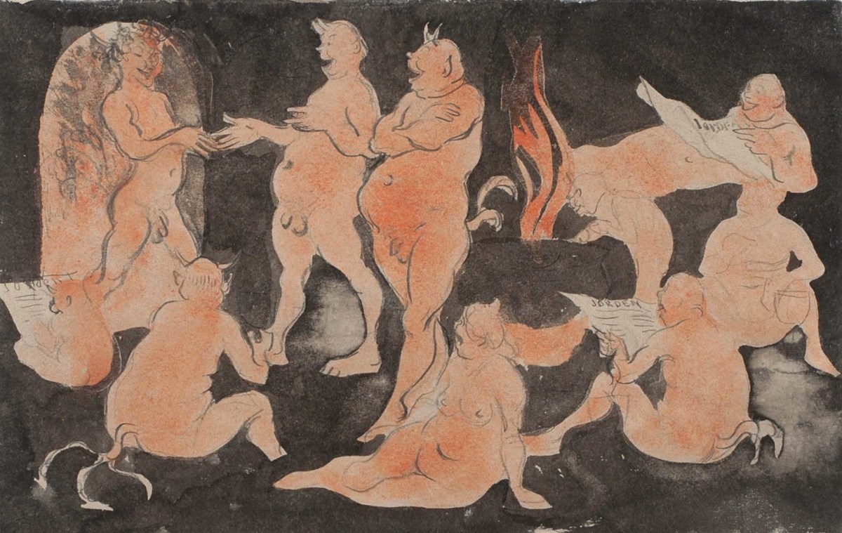 I bilden syns tio nakna, figurer, de flesta med horn och svans. Rummet alla befinner sig i är mörkt och dunkelt med en eldstad där elden brinner med höga flammor. Det tycks vara hett i rummet, figurerna är svedda och röda i skinnet. Tre av figurerna sitter och läser tidningen ”JORDEN” och till vänster syns en dörröppning genom vilken en person just kliver in, hjärtligt bemött av de andra.
