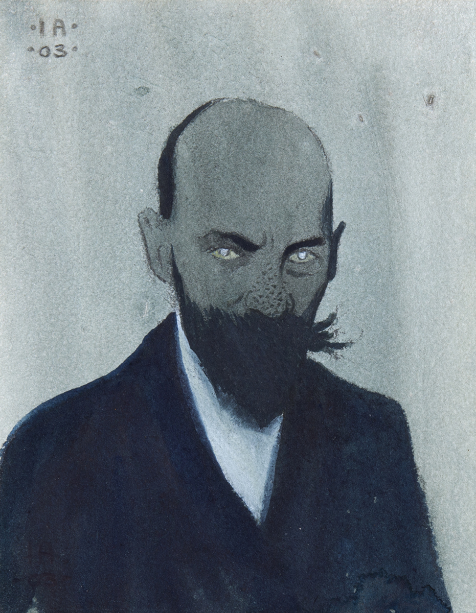 På bilden en karikatyr av Richard Bergh, svensk konstnär, konstskriftställare och museiman f 1858 d 1919. Richard Bergh var också Ivar Arosenius lärare på Konstnärsförbundets skola där IA började 1899. 1901 slutar IA på skolan och bryter med Bergh. Vi ser ett porträtt av Bergh, huvud och bröst, nästan rakt framifrån. Färgskalan är blå och kall och Berghs panna är missnöjt rynkad med ögon som betraktar oss med små pupiller och isande blick.