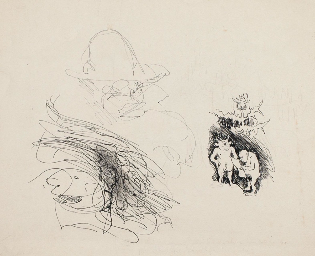 Påskrift (a tergo): sittande kvinna, man i hög hatt, två män i gräl, fönster (tecknat)