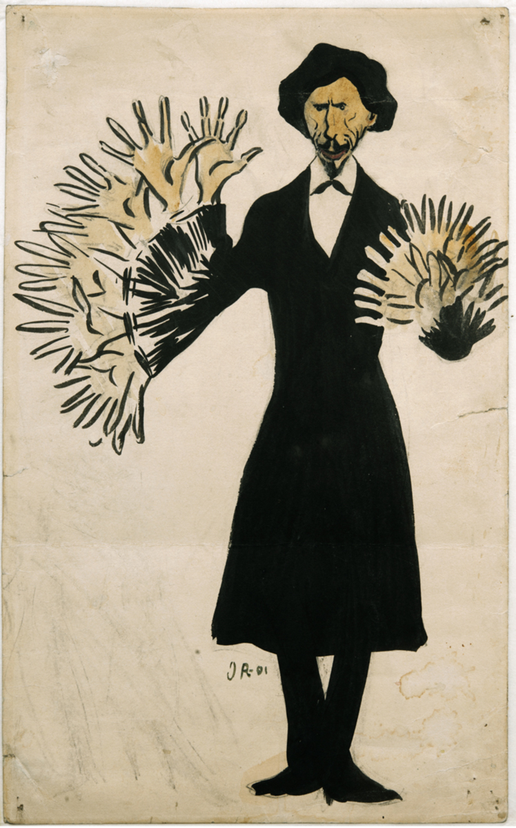Bilden visar en porträttkarikatyr av konstnären Ole Kruse (1868-1948). Vi ser Kruse i helkroppsfigur, stående framåtvänd klädd i vit skjorta och lång svart rock. Ivar Arosenius har här använt ett närmast "futuristiskt" sätt att skapa rörelse i bilden genom att gestalta Kruse med flera armar och händer vilket resulterar i en upplevelse av att Kruse gestikulerar vilt med båda armar.