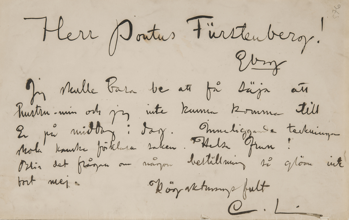 Jag skulle bara be att få säga att hustru-min och jag inte kunna komma till Er på middag i dag. Inneliggande teckningar skola kanske förklara saken. Hälsa frun! Blir det frågan om någon beställning så glöm ine bort mej. Högaktningsfult C.L.