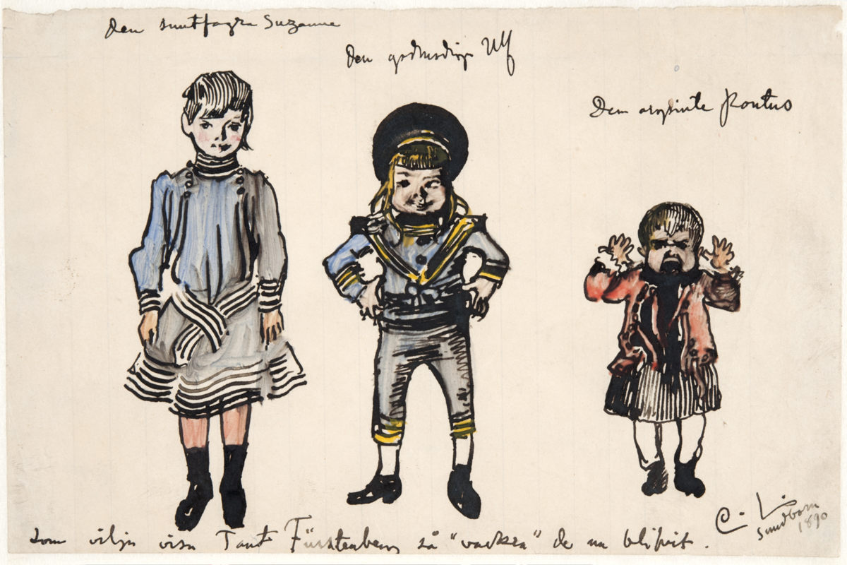 Denna akvarellerade teckning med de tre barnen på rad ingick i ett brev till Fürstenbergs. Den är en hälsning till Göthilda, som kände varmt för familjen Larsson.