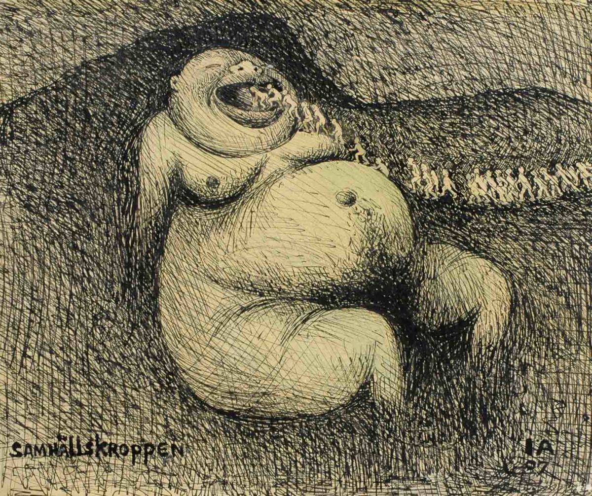 I Arosenius tuschteckning framställs samhället som en levande organism som sluka levande föda med hull och hår. En väldig kropp med hängande bröst och stor mage halvligger på rygg i ett landskap. En lång kö av små figurer rör sig genom landskapet och kliver på den stora kroppen in i dess öppna gap. Till vänster texten: ”SAMHÄLLSKROPPEN”.
