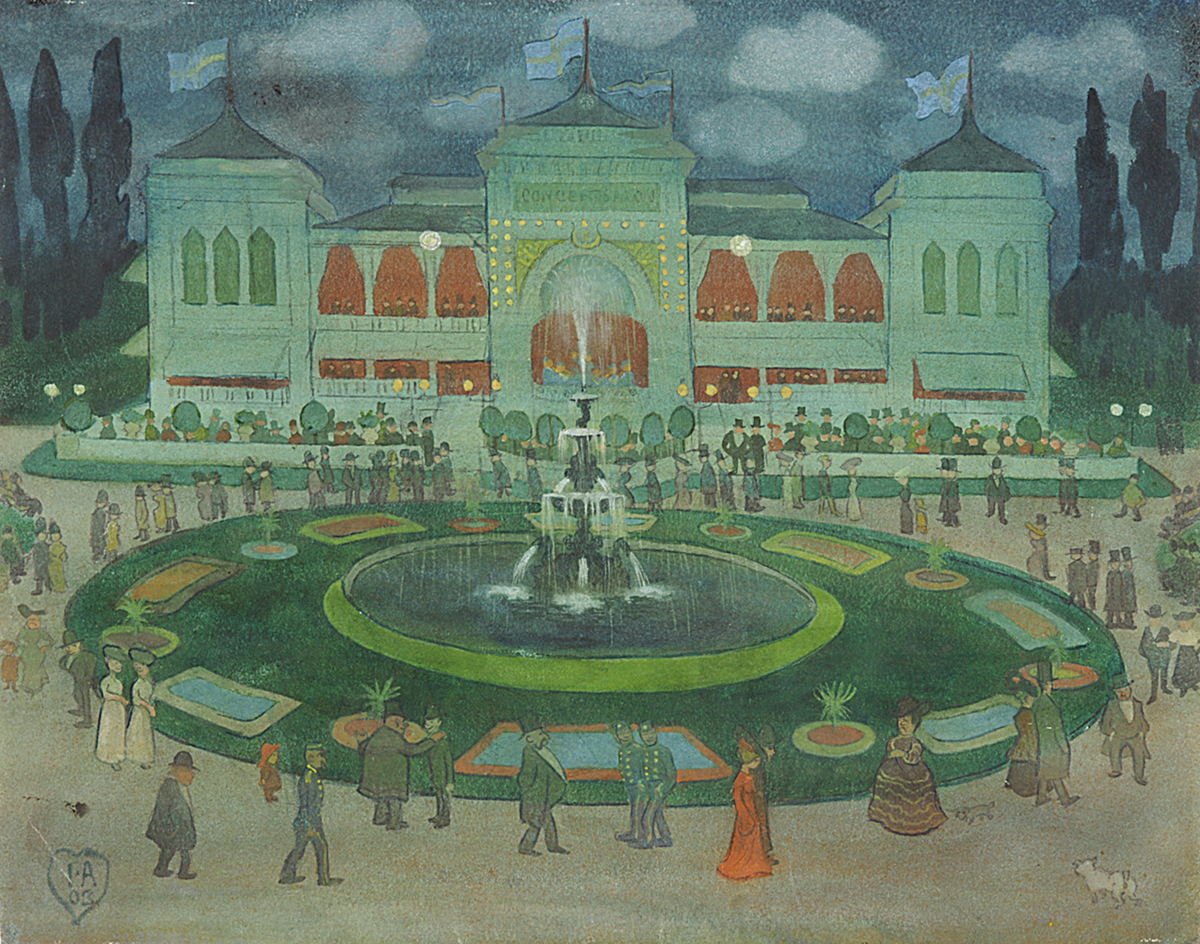 Motivet i denna akvarell är hämtad från Trädgårdsföreningen i Göteborg och dess huvudrestaurang, ”Concertsalon”, med terrass och musikestrad. Ett grönt ljus ligger över hela målningen som skapar skymningsläget i bilden. Lamporna runt och lyktorna på restaurangen är tända med vitt och gult ljus. Framför restaurangen ligger ”Rotundan”, en cirkelformad plantering med damm och pampig fontän i mitten. Från fontänen en kaskad av vatten och runt dammen syns symmetriska planteringar med palmer som exotiskt inslag. Cirkelrörelsen förstärks av att figurer i olika åldrar, storlekar och samhällsskikt rör sig runt fontänen. Här har Ivar Arosenius också lagt in ett porträtt av sig själv, på promenad arm i arm, tillsammans med Ester Sahlin.