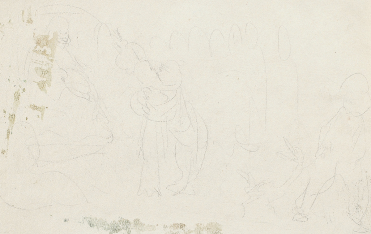 Påskrift (a tergo): Par uppför trappa. Liten man sittande med korslagt ben. (tecknad)