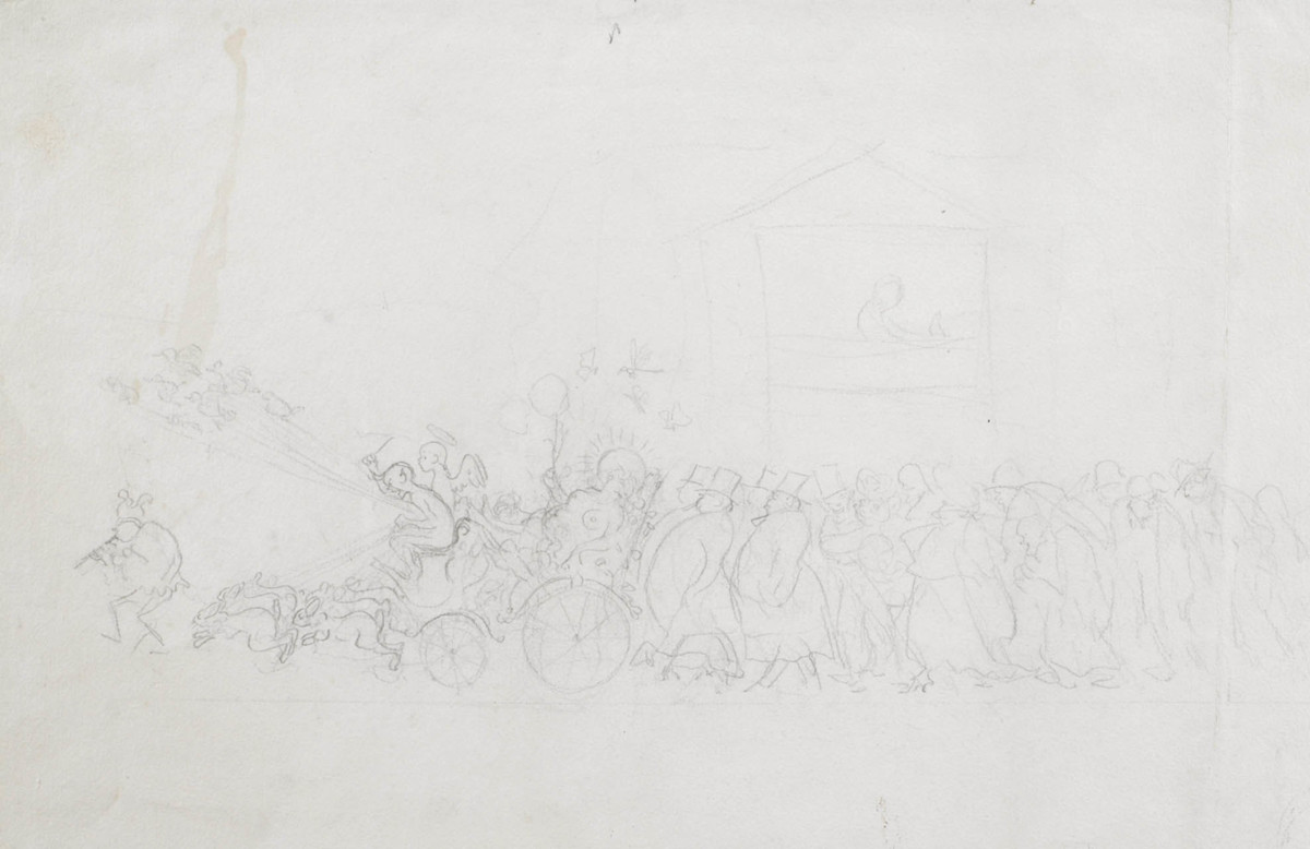 I skissen ses en procession med Venus i centrum, liggande naken i en blomsterprydd vagn som dras av harar och fåglar. På kuskbocken sitter en djävul med svans och horn bredvid en ängel med gloria och vingar. Längs fram i följet ses en narr som spelar flöjt och bakom vagnen följer ett tåg med olika figurer.