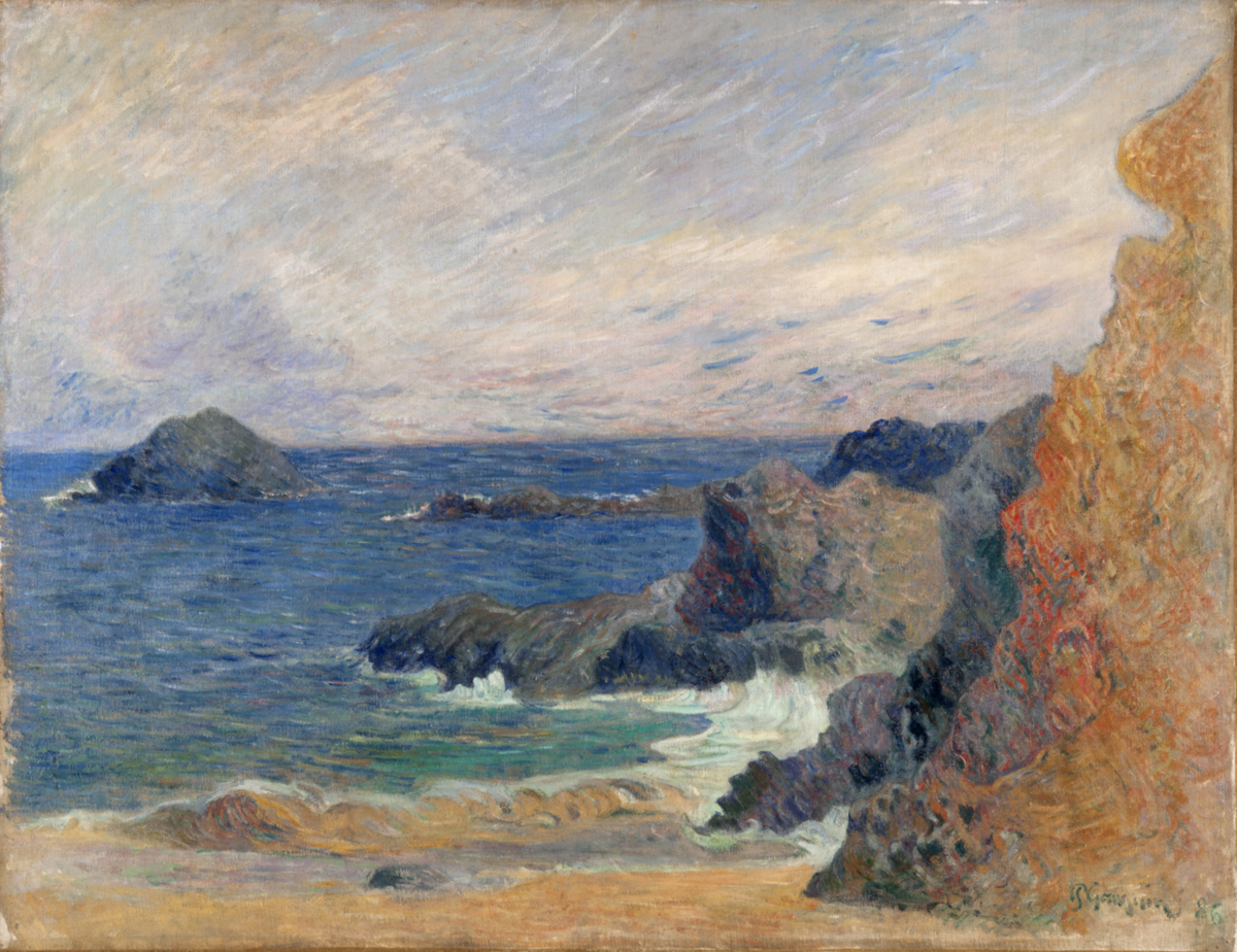 Det var först i trettioårsåldern som Paul Gauguin bestämde sig för att bli konstnär men gick då in för det med en osedvanlig hängivelse. I rask takt avverkade han olika stilinfluenser innan han kom fram till sin egen syntetism med dess enfärgade fält omslutna av böljande konturlinjer. I denna marin är influensen från impressionismen märkbar, med de synliga, rytmiska penseldragen och upplösningen av konturer. Man kan få Claude Monets kustbilder från Normandie i tankarna men man kan också, framför allt i klippan i förgrunden, se hur Gauguin strävar efter en personlig tolkning av motivet, där detta ges en dekorativ, böljande kontur. Färgerna drivs dessutom upp till en intensitet bortom naturalismen.