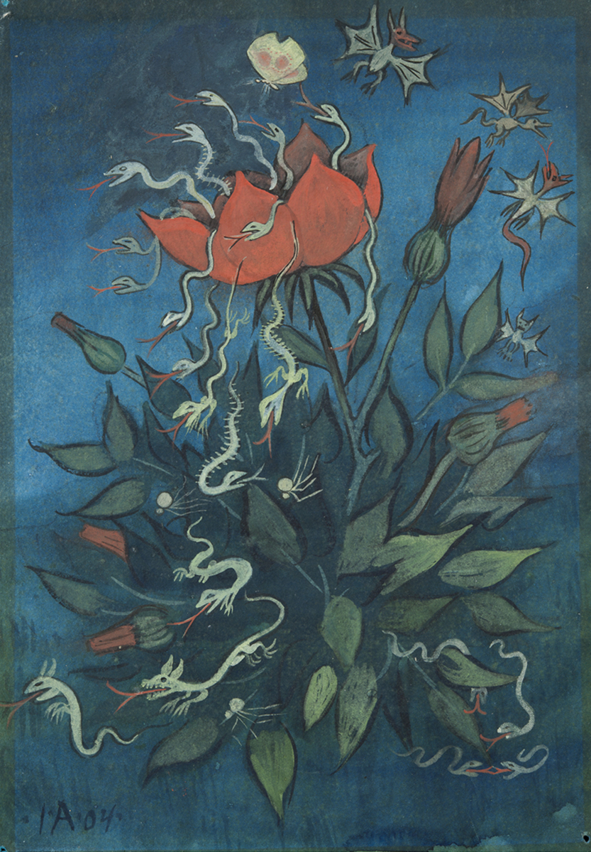Ett färgstarkt, dramatiskt blomsterstilleben som visar ett vackert fång av röda blommor i knopp och blom med gröna blad mot en bakgrund i blått. En av blommorna, intensivt röd, har just slagit ut i full blom och ur den väller det fram vita spindlar, små drakar och ödlor och ormar med röda, kluvna tungor.