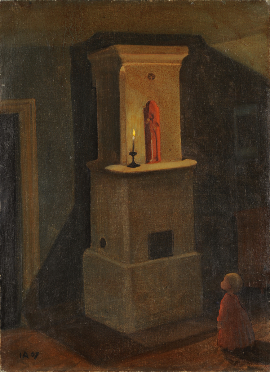 Lillan står förundrat och betraktar ljuset som brinner på kakelugnen. Man anar barnets fascination inför elden, men bilden har också något nästintill religiöst över sig. Till skillnad från många andra samtida konstnärer valde Arosenius att skildra Lillan och det hon såg ur barnets synvinkel. Som betraktare känner man hur kakelugnen växer till något stort och förunderligt, kanske ett altare.