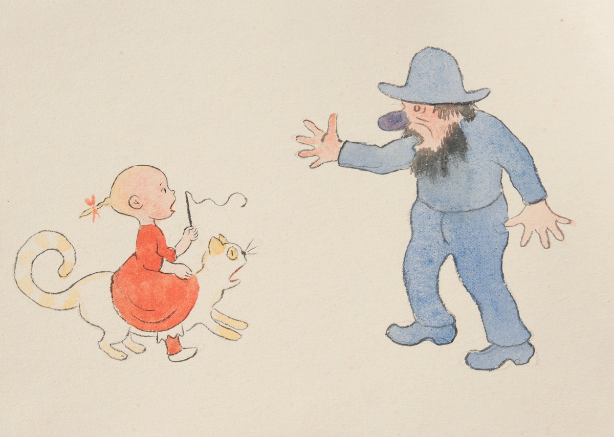 Ivar Arosenius, som också arbetade med bildberättelser för vuxna som en del i sitt konstnärskap, skapade Kattresan (1908) om och för sin dotter Lillan. I bild och text på vers skildrar boken hur Lillan ger sig ut på äventyr, sittande på kattens rygg. Klänningen har modets och kärlekens röda färg. Bilderna är utförda i tusch och akvarell med enkla konturlinjer och följer ett bestämt mönster: till vänster en bild av Lillan på kattryggen, till höger någon de möter och skrämmer på flykten: en nervös ko, en otäck gubbe eller en häst i blommig väst. Boken har älskats av många generationer barn, men kan för dagens unga läsare kännas både högtravande och skrämmande. Kattresan växte fram för privat bruk. När tanken på publicering föddes började Arosenius omarbeta bilderna. Han stramade till dem och arbetade mer medvetet med färgerna så att de skulle göra sig bättre i tryck och samtidigt blev Lillan prydligare och mer klassiskt söt. Den nya versionen blev aldrig färdig på grund av Arosenius tidiga bortgång, men sex av bilderna finns i museets ägo. Den obearbetade versionen trycktes postumt.