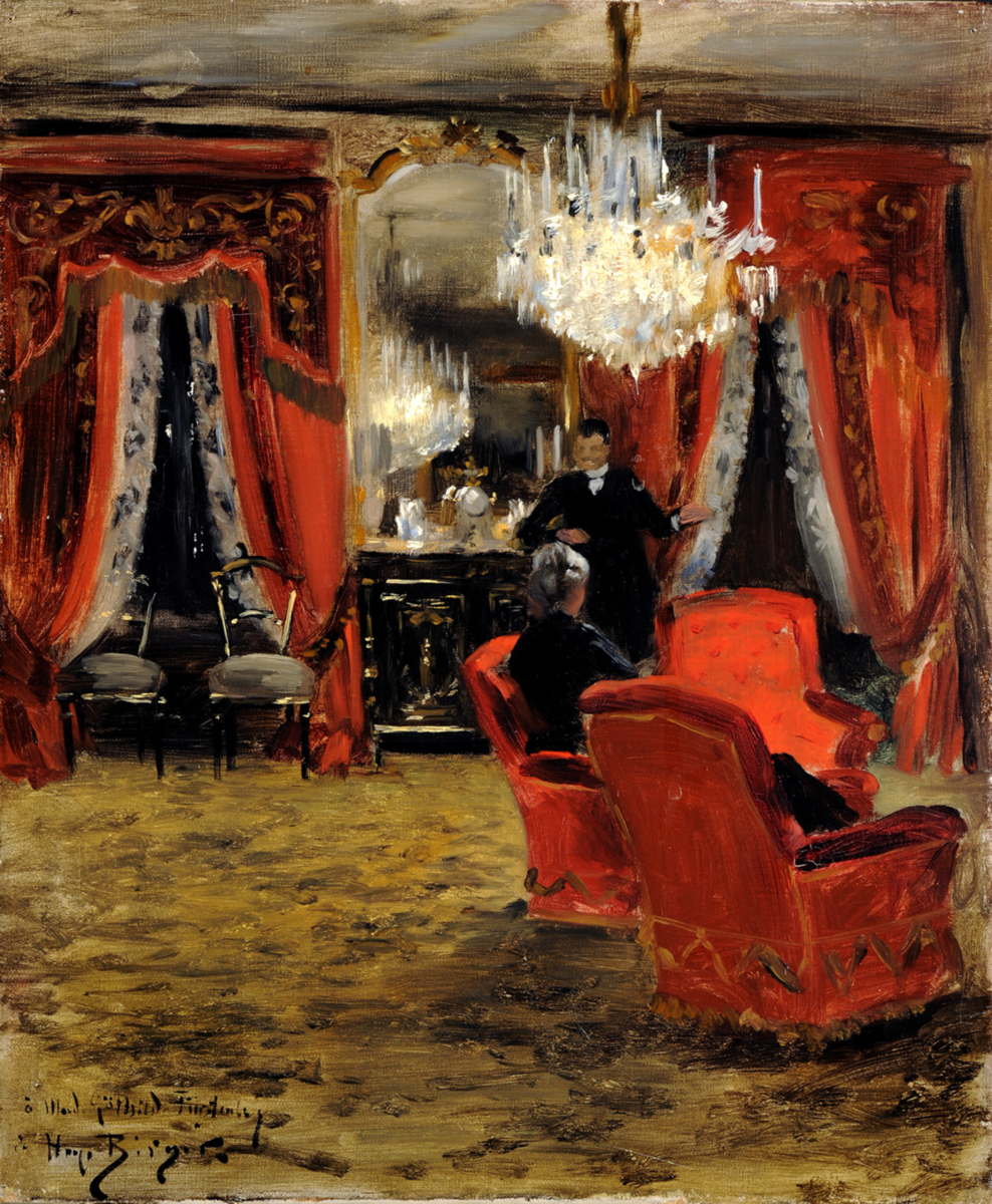 Interiören ger prov på tidens inredningsideal med mörka färger, rött och guld, mjuka material och stoppade möbler. Målningen är ovanligt impressionistisk i stilen för att vara av Birger, vilket kan bero på att det här inte handlade om någon stort upplagd salongsmålning utan om en mer anspråkslös dokumentation, som dock äger sitt både historiska och konstnärliga värde.