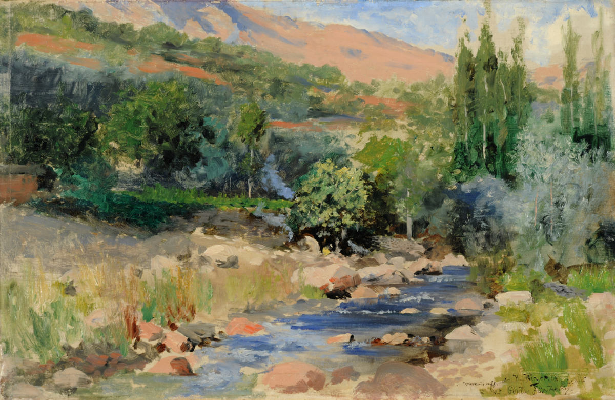 Denna landskapsstudie från El Genil visar prov på en större konstnärlig frihet än vi är vana vid från Hugo Birgers hand, som i sina färdiga arbeten ligger närmare salongsmåleriet. I denna oljeskiss har Birger fångat landskapets ljus- och färgverkan i impressionismens anda, med de ljusdränkta, flacka bergssidorna, den grönskande svalkan i sänkan där ån forsande rinner fram för att breder ut sig i förgrunden. Birger har fint fångat trädens olika gröna nyanser. Här och var skymtar den nakna duken fram. Stenar i förgrunden har fått sin modellering genom snabba, sparsamma penseldrag på ett sätt som påminner om Cézanne. Det är en fin friluftsstudie. Det impressionistiska uttrycket hänger samman med att det är just en studie och inte ett färdigt verk.