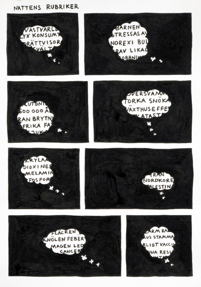 I serien Svarta Bubblor återvänder Lars Arrhenius till serieskapandet efter att under en längre period arbetat med animationer och digitala verk. Uttrycket är dock detsamma, i en förenklad bildvärld möter vi olika individer som lever i parallella världar i samhället. I serien, som gavs ut i bokform 2011, får betraktaren inblick i människors liv under natten. Genom pratbubblorna delges allt från sömnlösa tankar och frågvisa barns prat till gräl mellan makar.