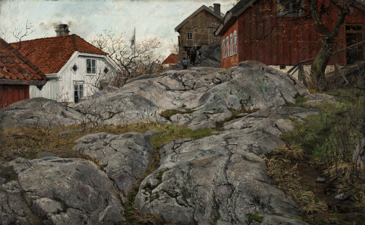 Kala klippor, med omsorgsfullt återgivna sprickor och skrevor där gräs biter sig fast, dominerar denna naturalistiska återgivning av ett norskt kustlandskap. En stig leder i en s-kruva över bergshällen i högerkanten och viker in bakom bergsknallen. Bakom klipporna skymtar ett vitt trähus till vänster och en flaggstång med en slak blåvit flagga bakom några avlövade träd och buskar. Längst tillvänster skymtar ett rött trähus med tegeltak. Till höger om bildens centrum finns ett högt beläget, brunt, timrat hus. En enkel trätrappa framför ett rött trähus leder upp från klipporna ut åt höger, bakom ett knotigt träd med några enstaka, gulnade löv. Det röda trähusets gavel, som upptar bildens övre högra fjärdedel, är lag i skugga medan dess långsida, med sina fyra gråmålade fönster, belyses av kvällssolen. Mellan husen klättrar två män och två pojkar med ryggen eller sidan vänd mot betraktaren – alla i mörka kläder utom pojken närmast, som har en ljusblå jacka och pojken till höger som har ljusa byxor.