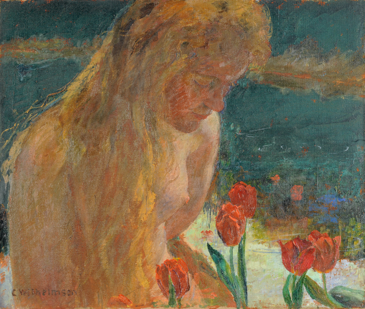 En ung flicka sitter vänd åt höger med huvudet framåtböjt och blicken sänkt. Det långa, rödblonda håret faller ner i vågor och döljer delvis hennes nakna överkropp. Ansiktet är lagt i skugga och har antagit en mörkröd färg. Axeln och det nakna bröstet är ljusare. I den mörka bakgrunden anar man en skog som tillsammans med den ljusa himlen speglas i den blanka vattenytan. I förgrunden finns några röda tulpaner som flickan avnjuter doften av. Med det liggande formatet beskärs bilden så att flickan kommer mycket nära betraktaren och formen betonas framför bilddjupet.
