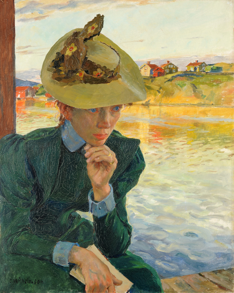 En ung kvinna med ett inåtvänt ansiktsuttryck sitter på en brygga i ett bohuslänskt fiskesamhälle, iklädd ljus hatt och mörkgrön klänning med violett krage och manschetter. Scenen med kvinnan i förgrunden ramas in av brädväggen i vänsterkanten och bryggplankorna nere till höger. Hon håller ena handen mot hakan i en tankfull pose och håller en bok i den andra. Ljusreflexer från vattnet spelar i det till hälften skugglagda ansiktet. I bakgrunden syns några bohuslänska röda och gröna stugor utspridda över klipporna. Några moln ligger utsträckta över den bleka skymningshimlen. Klipporna och deras spegelbild glöder i ett varmt kvällsljus. Kompositionen och kvinnans oåtkomliga ansikte bidrar till en känsla av instängdhet mitt i idyllen. Väntar hon på någon? Är hon på väg bort därifrån? Hon är finklädd. Kanske har hon tagit på sig söndagskläderna inför en resa eller ett möte. Eller så är hon en kvinna från staden.