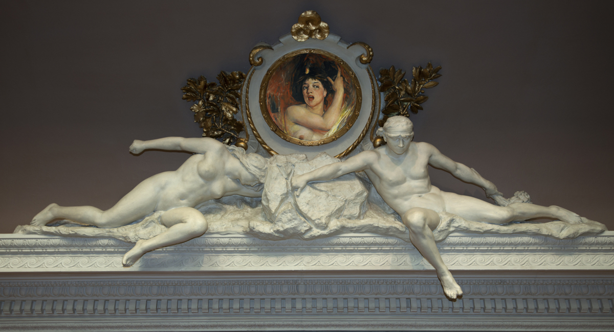 Denna skulpturgrupp ingår i de takdekorationer med allegorier över uppfinningar som magnetismen, ångan, dynamiten, elektriciteten, telefonen och fotografin som fanns i Fürstenbergska galleriet i Brunnsparken men som efter Fürstenbergs bortgång flyttades, först till Göteborgs Museum och senare till konstmuseet vid Götaplatsen. Per Hasselberg utformade skulpturerna med nakna mänskliga figurer och avbilder av uppfinningarna. Till dessa takgrupper målade några av de främsta opponenterna medaljonger: August Hagborg, Hugo Salmson, Ernst Josephson, Carl Larsson, Georg Pauli och Richard Bergh.