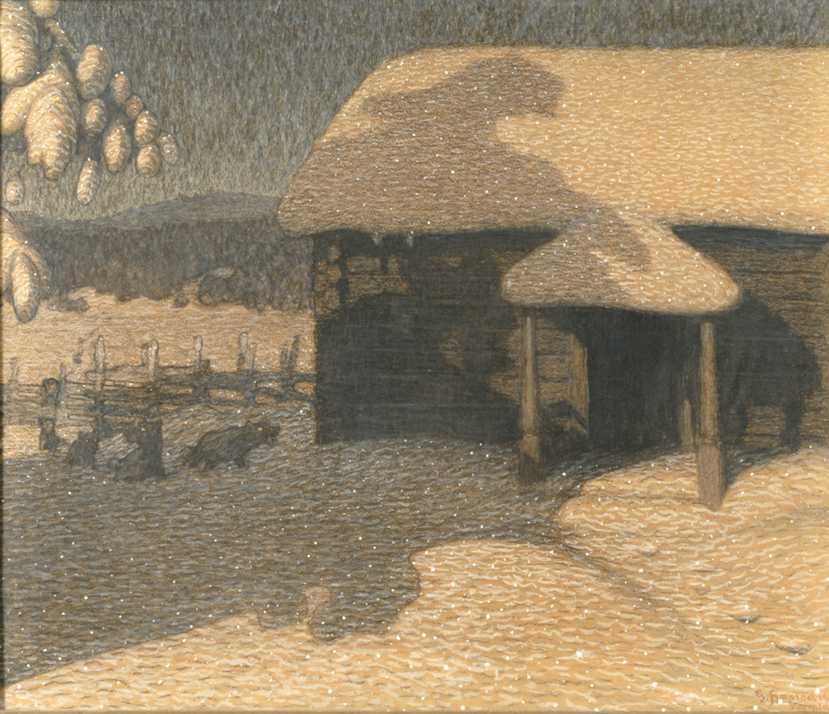 Motivet är en flock vargar som tar sig över en gärdsgård och söker sig fram till en knuttimrad gård belägen i ett ödsligt värmländskt vinterlandskap, en dal bakom vilken skogklädda åsar reser sig. Vargarnas ögon lyser i nattmörkret. Arbetet är en kolteckning som delvis akvarellerats.