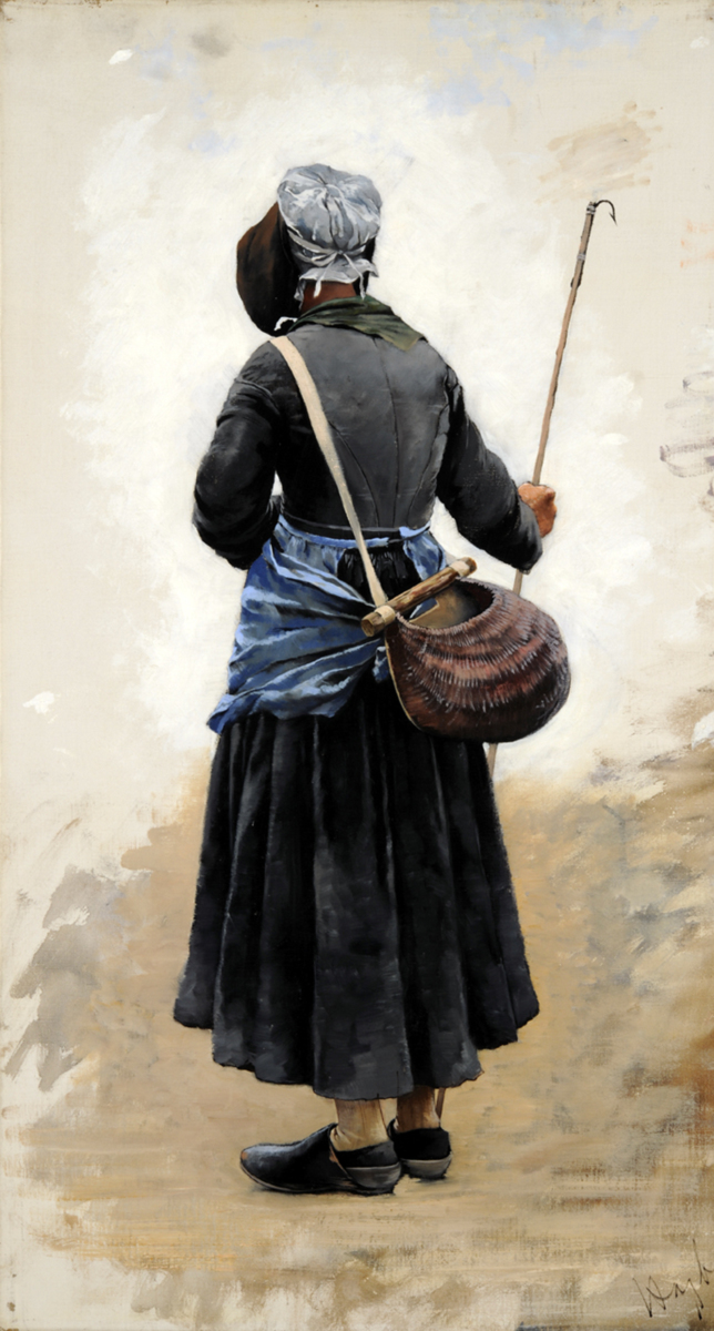 I den ena tablån finner vi längst upp till vänster Strand med båtar. Mörka båtar ligger uppdragna på sandstranden under en gråblå himmel. Det är mulet och stranden ligger folktom. (Under målningen anas en teckning av ett annat motiv.) Under denna bild återfinns Knäböjande flicka. En ung kvinna i enkla kläder – en grå överdel, gråblå kjol och grova träskor – sedd snett bakifrån knäböjer på sandstranden. Havet är inte utmålat. Istället kontrasterar den enfärgat vita bakgrunden mot den mörkare figuren. Flickans blonda hår är täckt av ett hårnät. Framför henne ligger en korg för musslor. I mittpanelen, Stående kvinna, ser vi en likaledes enkelt klädd kvinnogestalt, sedd bakifrån. Hon bär en huvudduk med skärm och har ett ljusblå förkläde. På ryggen hänger en korg. I handen håller hon en stav med krok. Uppe till höger återfinns Båt på stranden. En båt med halade segel har blivit stående i sanden under ebb. Det mörka skrovet speglas i några vattensamlingar i den ljusa sanden. Himlen är gråmulen och horisonten insvept i ett blått dis. Bilden längst ner till höger, Präst och korgosse, är färgrikare än de andra. Bakgrunden är samma endast antydda strand. Den katolska prästen i sin röklin och guld- och rödskimrande stola gör en välsignande gest med handen medan korgossen i sin röda klädnad med vit spets läser några verser. På marken står silverskålen med vigvatten och aspirgil som används för att stänka vatten.