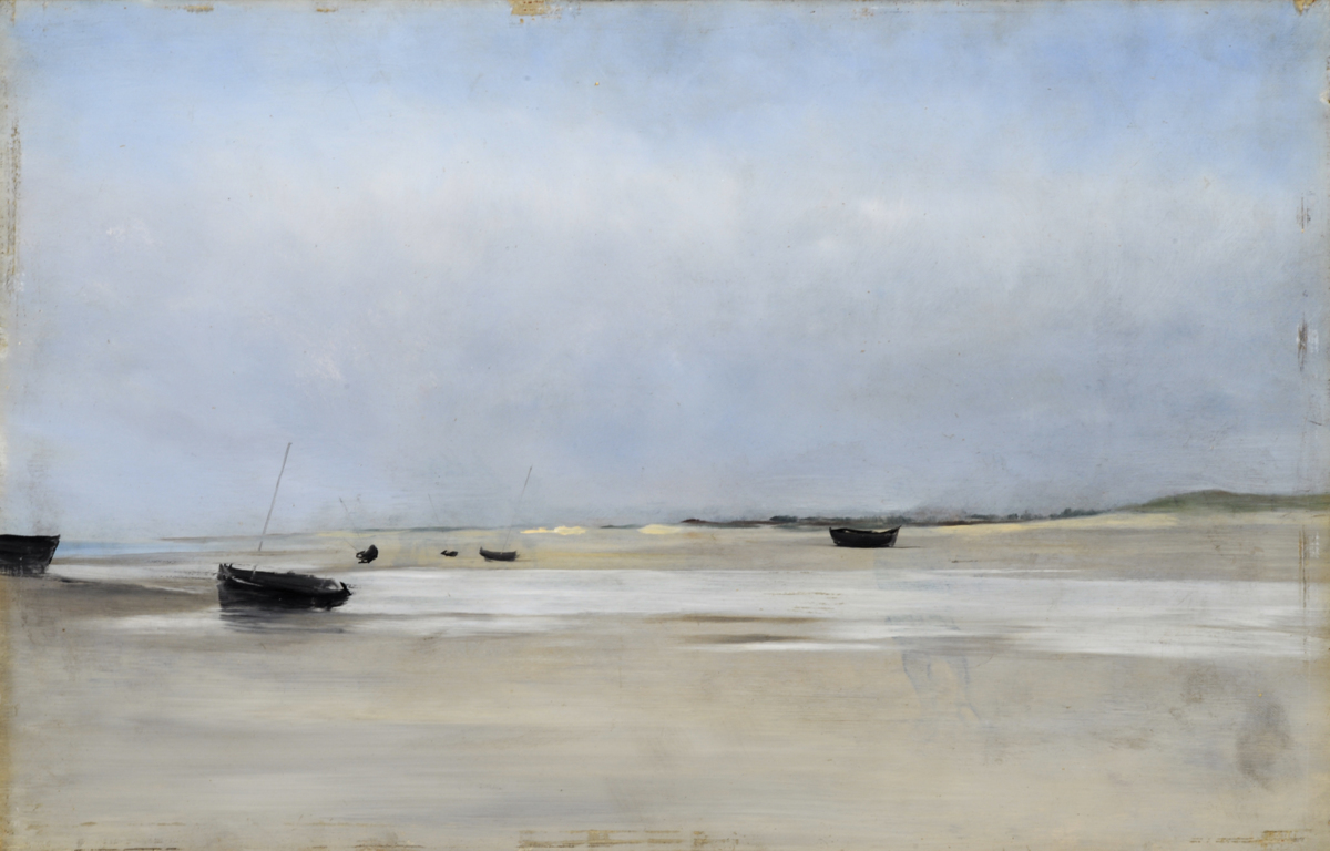 I den ena tablån finner vi längst upp till vänster Strand med båtar. Mörka båtar ligger uppdragna på sandstranden under en gråblå himmel. Det är mulet och stranden ligger folktom. (Under målningen anas en teckning av ett annat motiv.) Under denna bild återfinns Knäböjande flicka. En ung kvinna i enkla kläder – en grå överdel, gråblå kjol och grova träskor – sedd snett bakifrån knäböjer på sandstranden. Havet är inte utmålat. Istället kontrasterar den enfärgat vita bakgrunden mot den mörkare figuren. Flickans blonda hår är täckt av ett hårnät. Framför henne ligger en korg för musslor. I mittpanelen, Stående kvinna, ser vi en likaledes enkelt klädd kvinnogestalt, sedd bakifrån. Hon bär en huvudduk med skärm och har ett ljusblå förkläde. På ryggen hänger en korg. I handen håller hon en stav med krok. Uppe till höger återfinns Båt på stranden. En båt med halade segel har blivit stående i sanden under ebb. Det mörka skrovet speglas i några vattensamlingar i den ljusa sanden. Himlen är gråmulen och horisonten insvept i ett blått dis. Bilden längst ner till höger, Präst och korgosse, är färgrikare än de andra. Bakgrunden är samma endast antydda strand. Den katolska prästen i sin röklin och guld- och rödskimrande stola gör en välsignande gest med handen medan korgossen i sin röda klädnad med vit spets läser några verser. På marken står silverskålen med vigvatten och aspirgil som används för att stänka vatten.