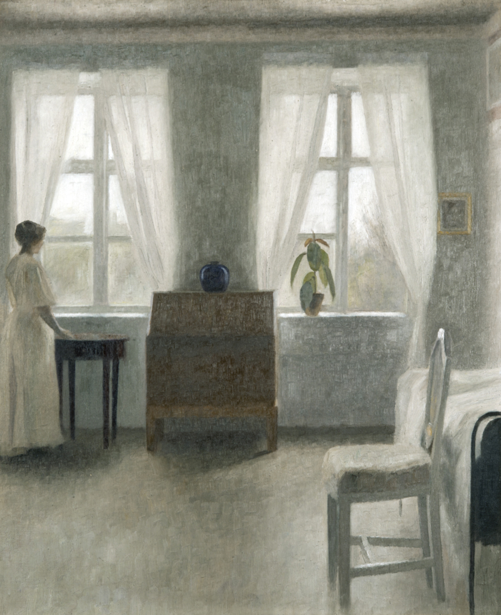 Hammershøi är mest känd för sina interiörer från lägenheten i Köpenhamn på Strandgade 30, samt ett par andra adresser i staden där han bodde tillsammans med sin hustru, men utförde även landskap och porträtt i samma asketiska stil. Denna interiör är troligen målad i Vilhelm och Ida Hammershøis första gemensamma bostad i Rahbeks Allé i Fredriksberg, dit de flyttade 1892. Bostadens rum målades av rensade på föremål med fokus på ljuset – skumrask, solljus som silas genom fönstren och mjuka skuggor som ger ett intryck av tystnad, stillhet och andakt. När han placerar in figurer, som hustrun, vänder dessa ofta ryggen mot betraktaren. Tankarna går till Caspar David Friedrich och den tyska romantiken snarare än till samtidens ljusa och färgstarka friluftsmåleri.