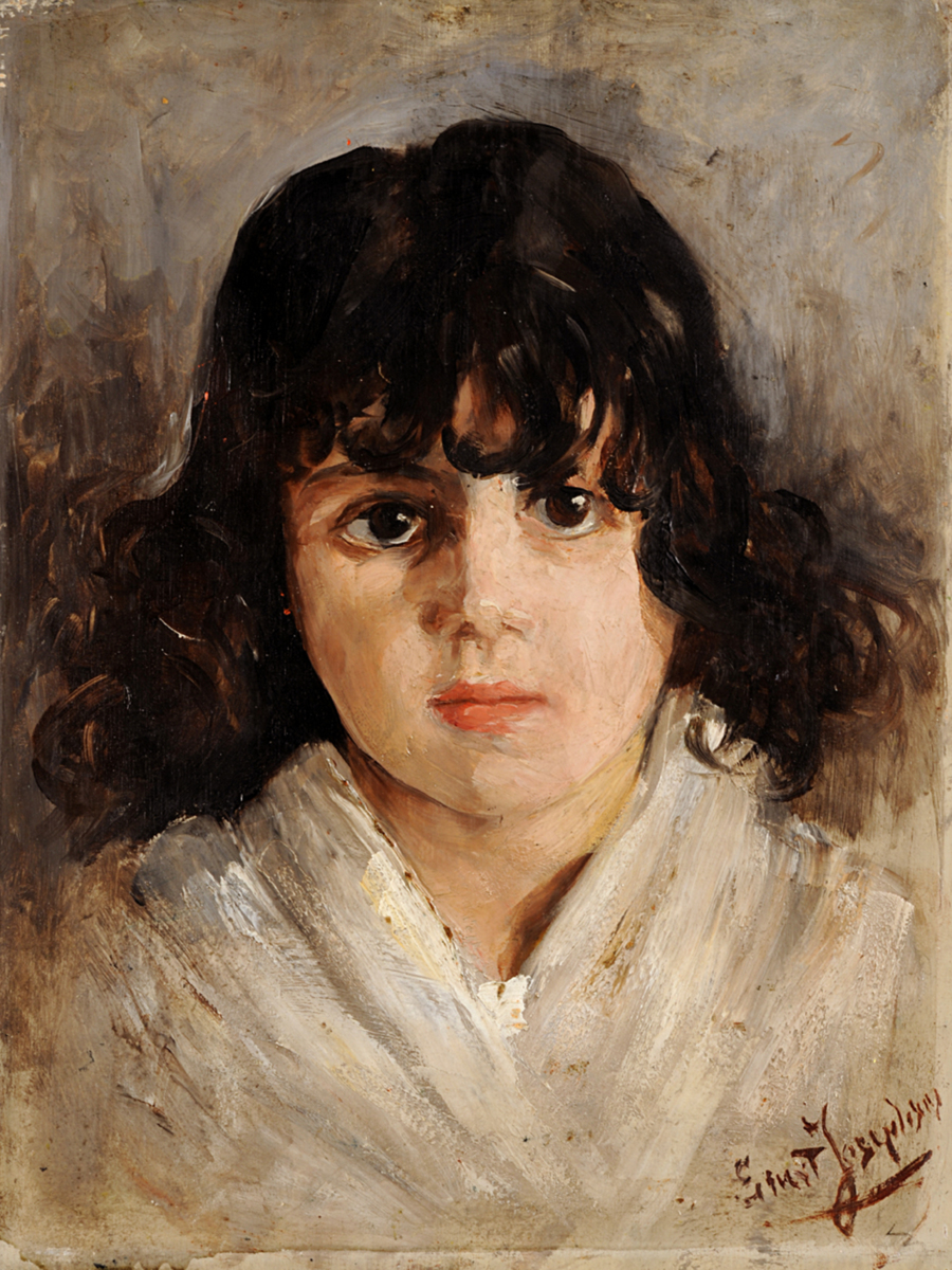 Den lilla flickan är avbildad en face (frontalt), och ser mot betraktaren med sina stora mörka ögon. Det mörka håret faller ner runt hennes huvud och lockar sig vid axlarna. Bakgrunden går i grått och umbra; hela bilden är dämpad i färgen. Hennes ljusa klädedräkt – kanske en sjal svept om axlarna – är målad med snabba, skissartade penseldrag. Ljuset faller in från vänster över ansiktet så att sjalen kastar en skugga vid halsen.