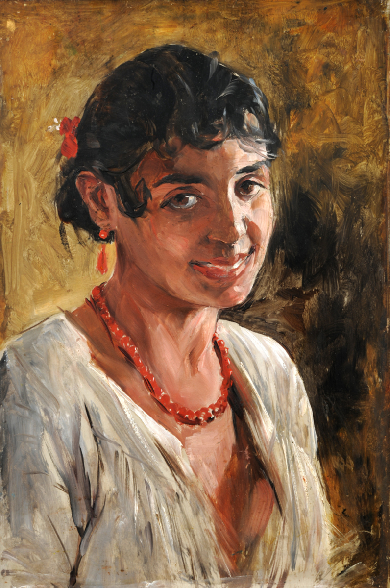 En ung romsk flicka med rött korallhalsband och röda örhängen ler mot betraktaren och ser på oss med sina stora mörka ögon. Hon har en röd blomma i det svarta håret. Den enkla, vita blusen är öppen i halsen och livfullt målad med snabba penseldrag. Ljuset faller in från höger och Josephson har förstärkt det genom att fördjupa svärtan till höger om ansiktet som en kontrast. Det livfulla måleriet och den fina personkaraktäristiken kan leda tankarna till Rembrandts sena porträtt.
