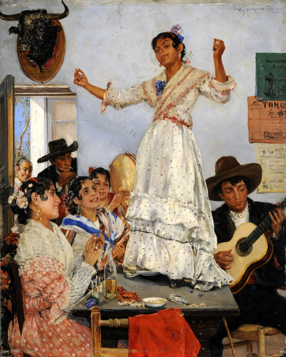 En kvinna i vit klänning och ljus sjal om axlarna dansar med knäppande fingrar på bordet i en taverna medan hon med höjt huvud ser mot betraktaren. Nere till höger sitter en man i hatt, mörka byxor, mörk jacka och vit skjorta och ackompanjerar på gitarren medan kvinnorna på andra sidan bordet ivrigt klappar takten. Kvinnan närmast väggen slår på en tamburin. En äldre man i hatt lutar sig in genom dörren till vänster och ser intresserat på med en cigarett i mungipan. Bakom honom tittar en leende äldre kvinna fram.
