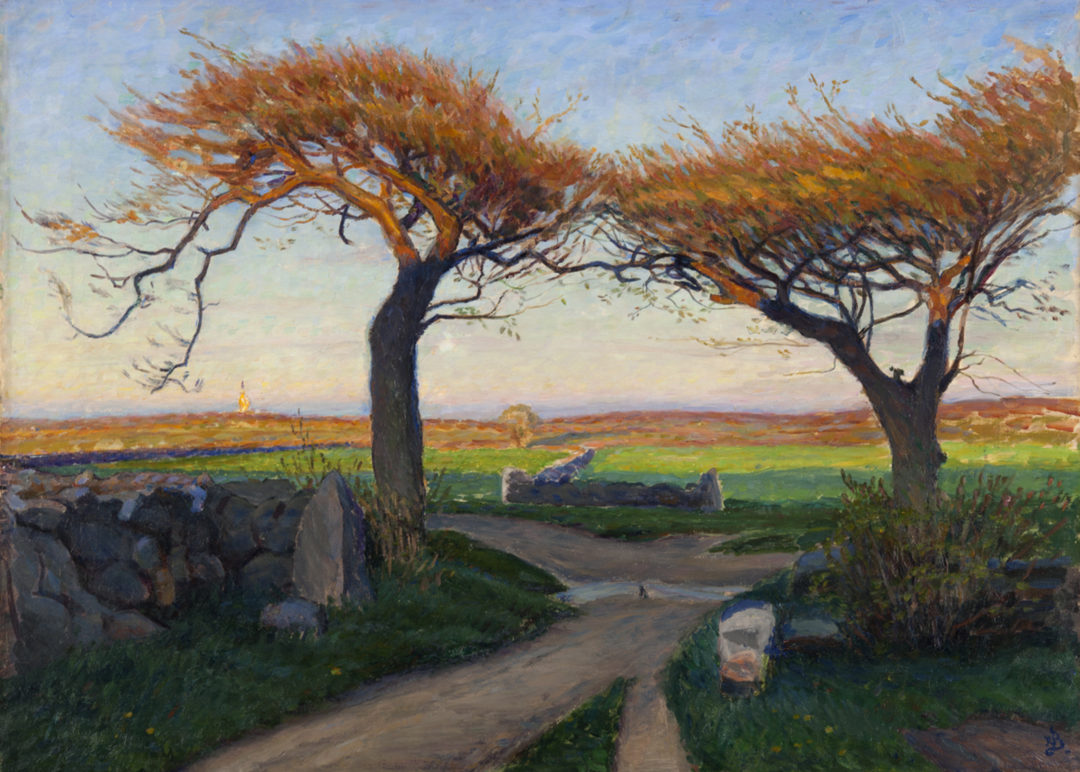 I ”Halländskt landskap” från 1895 möter vi två träd. Det varma ljuset får hedarna ner mot havet att glöda i gröna, gula, blå och röda kulörer. Landskapet har en förtrollad, närmast overklig atmosfär. Förgrunden är lagd i skugga medan trädens kronor lyses upp av kvällens sista solstrålar. Bortom träden breder det soldränkta, halländska landskapet ut sig. Vi leds in i bilden längs en väg som går mellan träden fram till ett vägskäl.