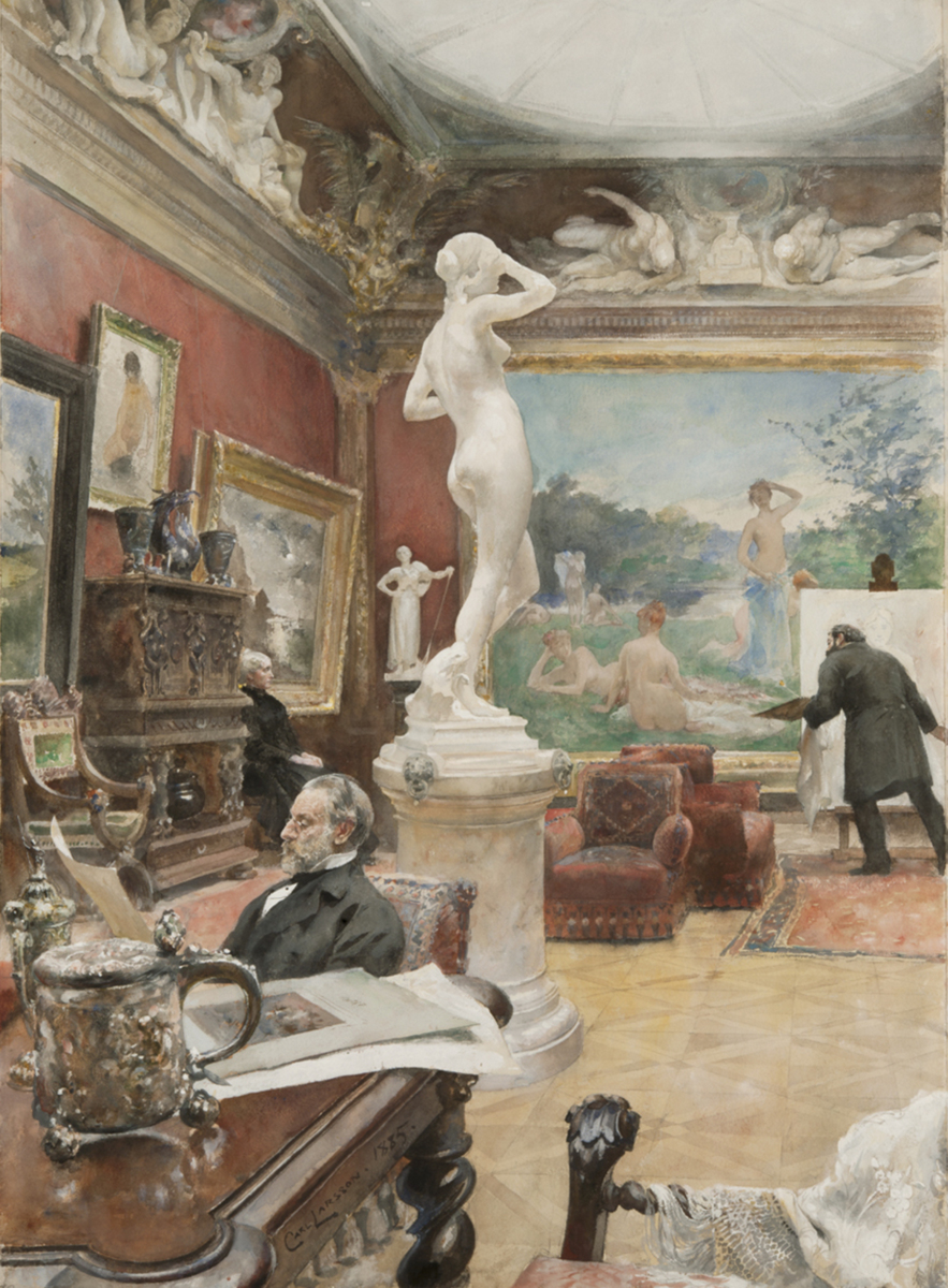 I denna akvarell skildrar Carl Larsson makarna Fürstenberg i sitt konstgalleri i Fürstenbergska palatset. Aktiviteterna är vardagliga: Pontus Fürstenberg studerar ett konstverk på papper medan Göthilda Fürstenberg sitter modell för ett porträtt av sysslingen Ernst Josephson.