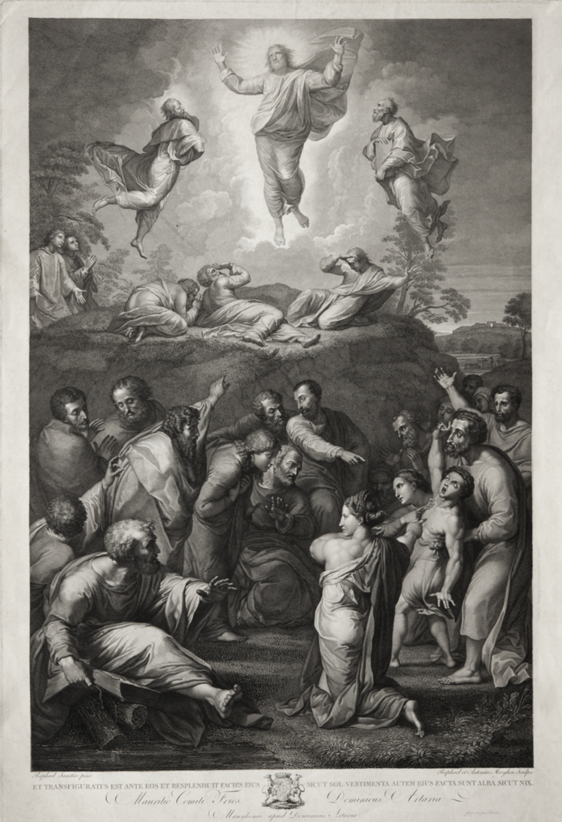 Påskrift (Nere i mitten): ET TRANSFIGURATUS EST ANTE EOS ET RESPLENDUIT FACIES EIUS SICUT SOL: VESTIMENTA AUTEM EIUS FACTA SUNT ALBA SICUT NIX. Munritio Comiti Fries Dominicus Artaria Mannhemii apud Dominicus Artaria. Imprivé per Ramboz.