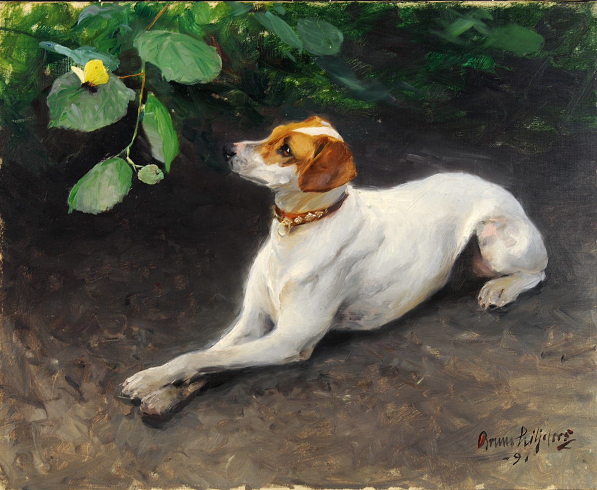 Målningen är ett porträtt från 1891 av makarna Fürstenbergs hund och är rimligen utförd på beställning. Hunden ligger med korsade tassar och betraktar en fjäril. Samma år förekommer hunden i Carl Larssons akvarellporträtt av Göthilda Fürstenberg där den krupit ihop vid den avporträtterades fötter. Makarna hade tidigare haft en tax som målades av Ernst Josephson 1884. Denna målning ingår ej längre i Fürstenbergska galleriet.