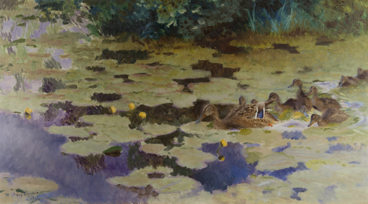 Bruno Liljefors räknas som en av de främsta svenska djurmålarna genom tiderna. Hans storhet låg i förmågan att trovärdigt skildra djuren i deras miljö och samtidigt dramatisera deras kamp för överlevnad. Hans bilder ger ofta uttryck för storslagna naturupplevelser. Men det kan, som här, vara en storslagenhet i det lilla. Liljefors går gärna nära sitt motiv. Andfamiljen simmar fram mellan näckrosbladen i vattenytan, vilken återspeglar den violetta himlen. Bilden kan påminna om Claude Monets näckrosmålningar från Giverny. Liksom hos Monet finns här en friskhet i måleriet, men då Monet gör vatten-speglingen till huvudsak utgör den för Liljefors mer av bakgrund till djurens liv. Det är en relativt sen målning av konstnären. Måleriet är också påfallande modernt och skissartat. Men någon modernist var Liljefors inte. Han var mer intresserad av att studera naturen än att dekonstruera den. Andkull bland gula näckrosor är en färgsprakande skildring av andungarnas ivriga väg ut i livet, än så länge i moderns spår.