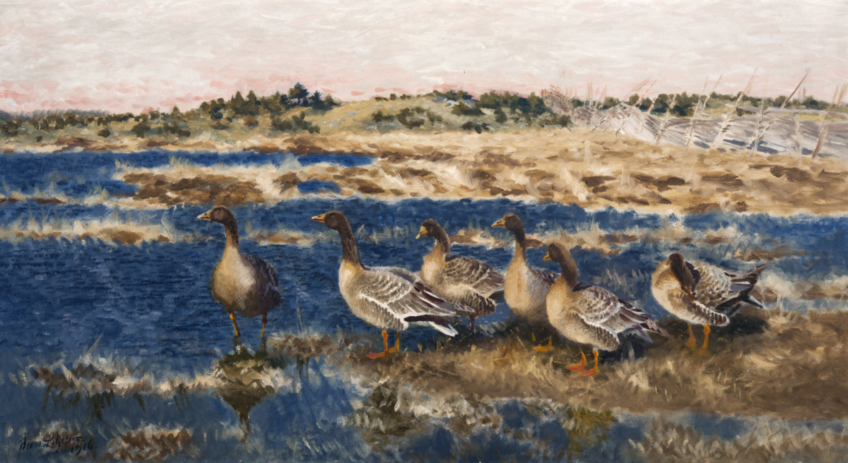 Djurmålaren Bruno Liljefors var en naturalist som trots intryck från såväl impressionism som japanska träsnitt fortsatt hade den noggranna naturiakttagelsen som stadig grund för sin konst. Även om Liljefors ibland kan arbeta mer skissartat har man en känsla av att han vet precis hur fåglarnas fjäderdräkter eller rävens päls ter sig i olika belysning. Denna målning, föreställande några vildgäss i havsbandet, är påtagligt impressionistisk i stilen. Kulören är uppdriven med det mörkblå vattnet som kontrasteras mot den rosafärgade himlen och den brungröna vegetationen. Gässen är rytmiskt utspridda i bilden, med halsar och huvuden riktade åt olika håll för att leda blicken i en sicksackrörelse, först ut till vänster och sedan tillbaka in i landskapet med den vindpinade gärdesgården i bakgrunden. Vad spanar de efter? Är det snart dags att ta av mot varmare trakter?