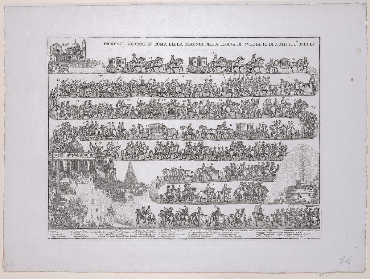 Påskrift (Upptill i plåten): INGRESSO SOLENNE IN ROMA DELLA MAESTA DELLA REGINA DI SVEZIA IL DI XXIII.FEBro. M.DCLV.