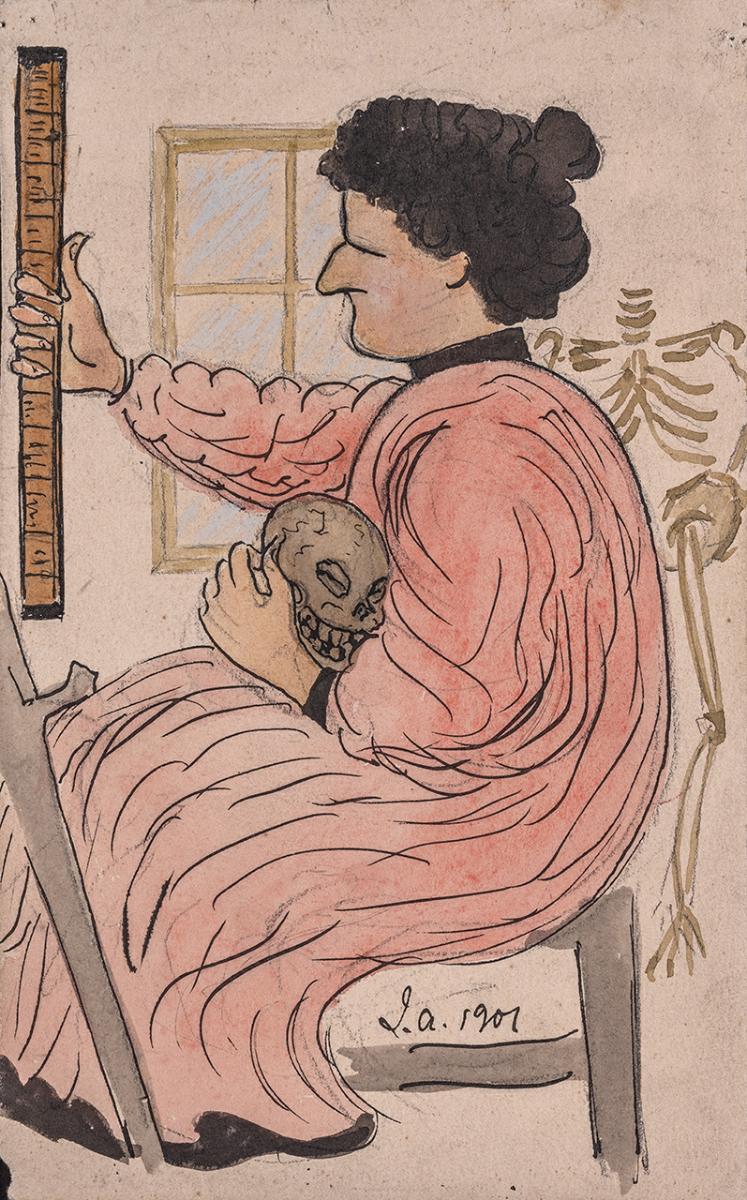 Karikatyr av kvinnlig elev på Valand (med tillägg av okänd hand)
