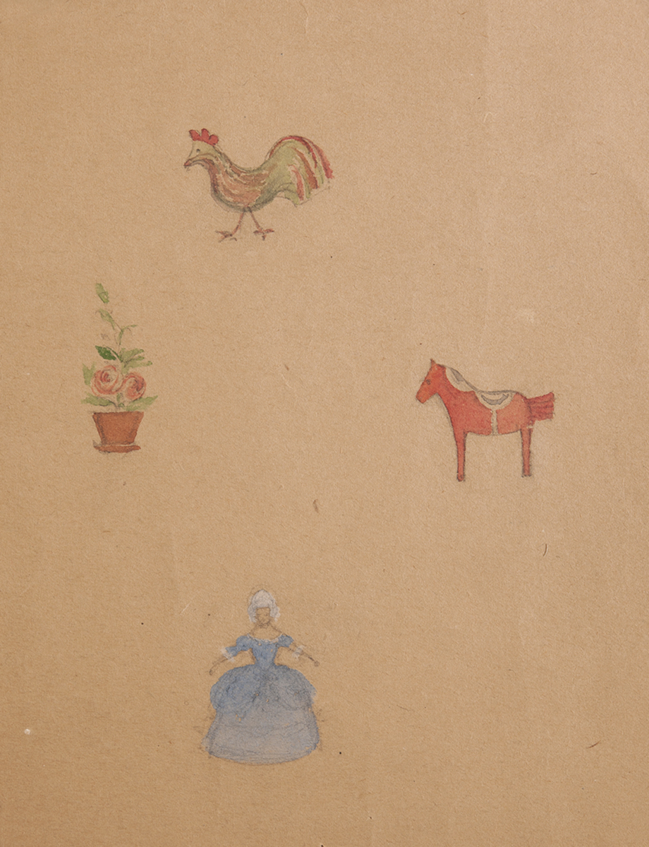 Dalahäst, tupp, kvinna och blommor i kruka