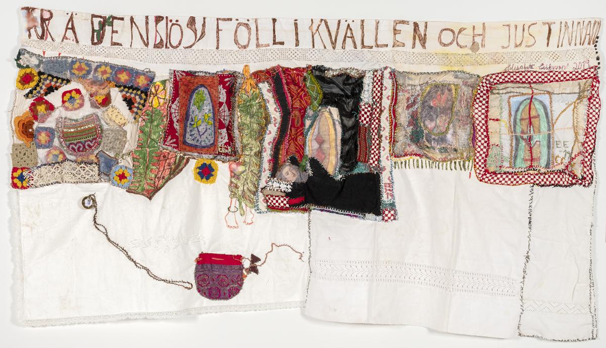 Applikation, broderi och tuschpenna på textil och papper, mocka, metall, plast